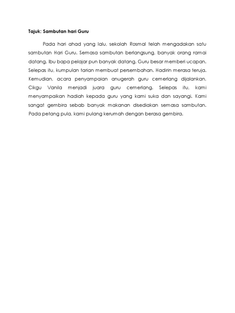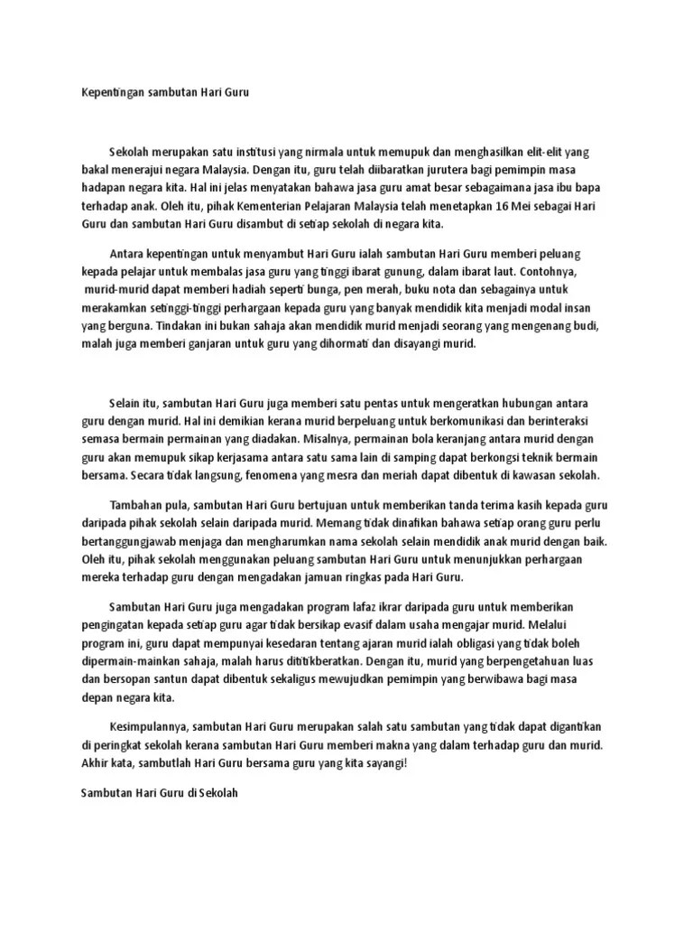 Sambutan hari guru, teacher's day disambut pada 16 mei setiap tahun sebagai penghargaan kepada semua guru, disamping memberi peluang kepada para pelajar untuk membalas jasa guru yang tinggi ibarat gunung, dalam ibarat laut. Setiap murid dan guru dan melakukan persiapan sambutan, sama ada dalam bentuk dari pusat lambang tersebut, muncullah buku yang memberi ilmu pengetahuan dalam segalalapangan bagi kepentingan negara yang aman dan makmur. Film jepang_ guru les main sama murid. Menarik perhatian ibu bapa, pelajar dan orang ramai tentang kepentingan dan peranan warga guru dalam masyarakat malaysia. Contoh karangan pentingnya sambutan hari kebangsaan untuk mengukuhkan jati diri dan perpaduan kaum.