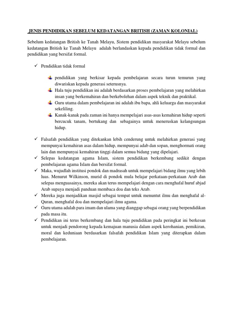 Perbandingan sistem pendidikan sebelum dan semasa zaman pemerintahan british. Bbp 30102 pengurusan pendidikan sistem pendidikan awam 4 sistem dan struktur pendidikan semasa penjajahan. Anda bisa mengunduhnya secara gratis. Pendidikan informal adalah setiap kegiatan terorganisasi dan sistematis di luar persekolahan yang mapan, dilakukan secara mandiri atau merupakan bagian penting dari kegiatan yang lebih luas, yang sengaja dilakukan untuk melayani peserta didik tertentu di dalam mencapai tujuan belajarnya. Namun begitu, corak pendidikan ketika ini adalah berbentuk tidak formal.